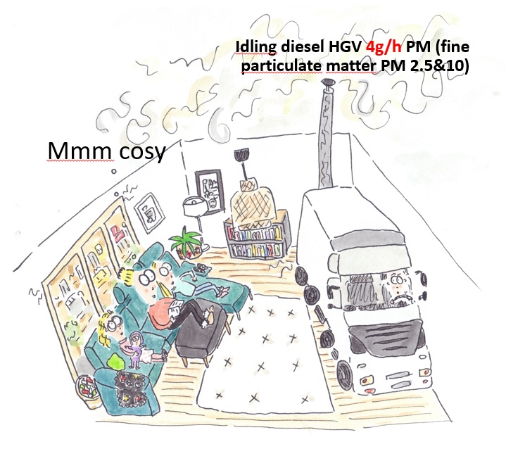 I wanted to try to demonstrate just how bad even the ‘Eco’ wood fire burners are in terms of air pollution by comparing them to diesel trucks: